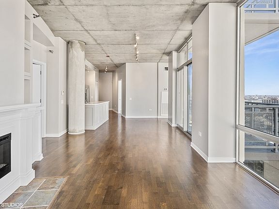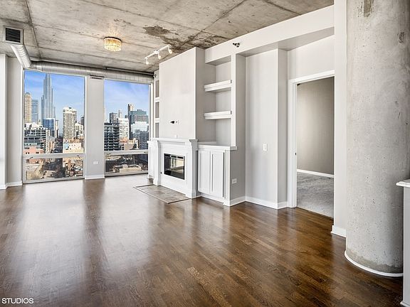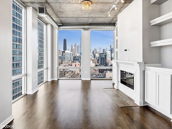 Experience Stunning Views from this 2 bed, 2 bath corner unit in River North! With exposures to the east, north, and west, you'll be taking in the City Skyline, Lake, and River. The expansive living area features custom built-ins, an electric fireplace, and high ceilings with floor-to-ceiling windows that fill the unit with natural light. The open kitchen is perfect for cooking enthusiasts and entertainers alike, featuring a Thermador appliance package with a professional-grade dual fuel range, dishwasher, and microwave. Marble countertops and a spacious peninsula provide an ideal setting for meal preparation and social gatherings. Both bedrooms are fully enclosed and equipped with custom electric shades, while the primary bedroom comfortably accommodates a king-size bed. Step out onto your balcony and enjoy the magnificent city views. Deeded garage parking is available for $35k. This building is conveniently located right off the River Walk, and in close proximity to a dog park, playground, restaurants, East Bank, public transportation, and all River North has to offer!