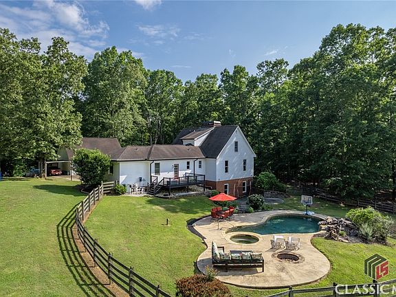 Beautiful home with Pebble tech salt water pool. Property includes a 2 stall barn and a fenced pasture. This home was made to look like a 1900's farmhouse, but has all of the bells & whistles of a new home! Foyer entrance with gorgeous heart of pine floors throughout the main level. 3 brick fireplaces on the main level 1 in the formal dining, 1 in the cozy family room, and 1 in the eat-in kitchen. Kitchen features custom cabinets, granite countertops, tiled backsplash, farm sink, and walk-in pantry. Spacious owner's suite with double vanities, soaking tub, and tiled shower. Guest suite in the finished basement. Fenced pastures for your animal friends, a barn, an amazing pool, and a detached garage with storage space above!