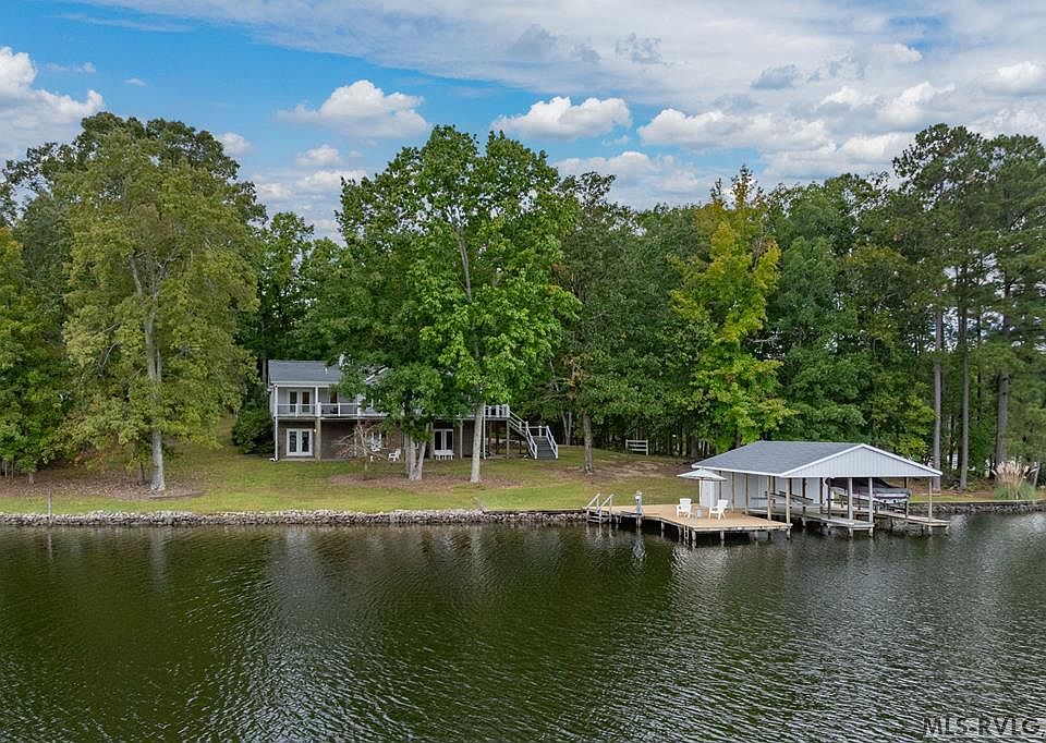 Welcome to your lakeside getaway on Pea Hill Creek, one of the most desirable spots on Lake Gaston, known for its clear water and sandy bottom. This custom built, one owner home sits on a lovely flat lot with over 200' of waterfront, giving you the feeling of being completely surrounded by water. With deep water at the end of the dock (over 8 feet), this property is ideal for swimming, fishing, or just jumping in to cool off on a hot summer day. The recently replaced roof on the home & boathouse means you can enjoy the lake with ease, knowing the big updates are already done. Inside, you'll find a spacious open floor plan that brings everyone together. The kitchen features custom built cabinets with plenty of storage and room for cooking big family meals or entertaining friends. The dining area flows naturally into the living and family rooms, where large bay windows fill the space with light and stunning lake views. Step outside to the covered waterfront deck, perfect for family dinners outdoors, morning coffee, or watching the sunset over the water. The decks are all low-maintenance composite with new vinyl railings, so you can spend more time relaxing and less time on upkeep. The primary bedroom offers peaceful lake views and its own door to the covered deck, an ideal spot to unwind at the end of the day. All of the bedrooms are generously sized. Downstairs, the partially finished lower level is ready for your touch, framed, plumbed, wired, and with HVAC lines already in place. It's the perfect opportunity to add more living space, a game room, or extra bedrooms. Other updates include new skylights and a freshly pumped septic system (10/25). The home is being sold partially furnished, making it easy to move right in and start enjoying lake life.
