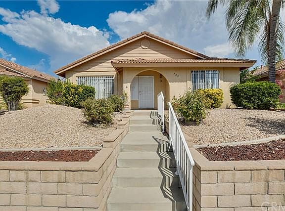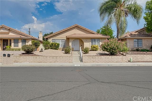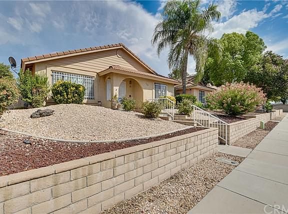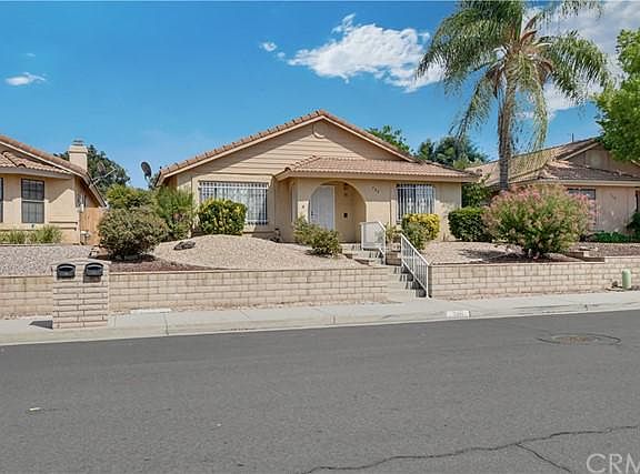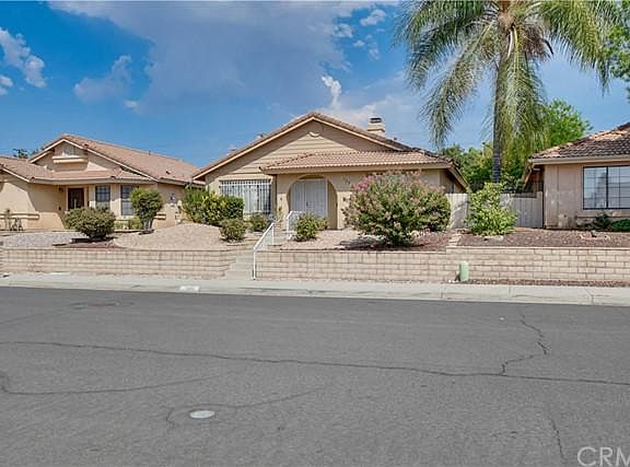 Beautiful single story 2 bedroom 2 bathroom home located in the 55+ Hemet Del Sol community in West Hemet. This 1991 built home features 1,166 square feet of living space and sits on a 5,227 square foot easy to maintain lot with professionally designed desert landscaping in the front and back! This home features newer laminate wood flooring, upgraded fixtures, gas starter fireplace, spacious rooms with ample closet space, an attached 2 car garage and much more! Approaching the home, you will automatically notice the beautiful stairway entry leading up to the doorway, surrounded by meticulously maintained rose bushes and hedges. Coming into the home through the front door, you are greeted by the spacious light and airy living room featuring a gas fireplace with a mantel, a light paint scheme, high vaulted ceilings and gorgeous laminate wood flooring, which is featured throughout the living room, dining room, hallway and bedrooms. To the left of the living room is the formal dining room with a large window allowing a ton of natural light to fill the space, a ceiling fan and opens up to the kitchen. The lovely kitchen offers custom tiled countertops with laminated flooring, oak cabinets providing lots of storage including a pantry, a large garden window, gas stove and opens up to an additional dining area with a ceiling fan and a glass sliding door leading outside. The laundry room is conveniently located inside, off the kitchen and additional dining area, featuring cabinets for storage and has a door giving an access point to outside. To the right of the living room is the hallway leading to the bedrooms and bathrooms. The large master bedroom is at the end of the hallway and features laminate wood flooring, high vaulted ceilings with a ceiling fan, a walk-in closet, a sliding glass door granting a private access point to the backyard and has an attached bathroom with dual vanity sinks, linen storage and a walk-in shower. The secondary bedroom is also large with an oversized closet, ceiling fan and has upgraded laminate flooring. The hallway bathroom features a shower and tub combination and has linen storage. The backyard is a wonderful space for relaxing year round with a large covered patio featuring a ceiling fan, has low maintenance landscaping and an abundance of space awaiting your personal touches! The Hemet Del Sol community is conveniently located near major highways, shopping, dining, and entertainment.