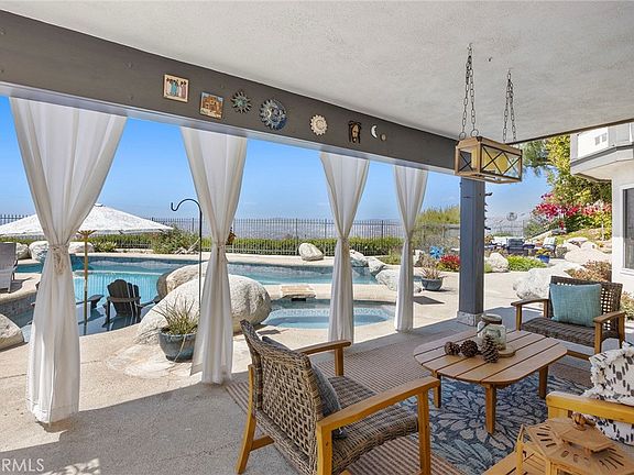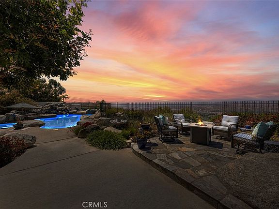 This home is a WOW in every sense of the word!!! A carpet of city lights is your backyard with breathtaking grounds that offer every amenity to make you feel like you are in a Polynesian resort. Custom designed sparkling pool with a dramatic rock waterfall, putting green, and a palapa-covered BBQ center for those very fun events. You are literally on top of the world to enjoy star gazing and watch the city come alive at night. On top of all that there is a separate garden with bountiful fruit trees including peach, avocado, and apple. Step inside to the soaring ceilings and expansive windows that flood the home with natural light, accentuating the richly stained wood and porcelain tile flooring throughout. The formal living and dining rooms, ideal for entertaining, open through French doors to the scenic outdoors. The chef’s kitchen is a culinary showpiece—outfitted with a center island, gleaming granite counters, a full tile backsplash, customized open shelving, top-tier appliances and generous walk-in pantry. A charming casual dining nook is set into a sunny bay window, while the adjacent family room features a warm fireplace flanked by custom built-ins and a full-size walk-behind wet bar with attractive copper ceiling. A versatile downstairs bedroom or office and a full bath offer flexibility for guests or workspace. Upstairs, the luxurious primary suite is situated at the rear of the property, and is a true retreat—complete with its own intimate fireplace and jaw-dropping view balcony, where you’ll savor the evening stars and blankets of distant lights. The spa-like bath boasts sleek tile flooring, rare gleaming Blue Ice granite countertops, dual sinks, separate vanity, large walk-in shower with custom tiles, and a sumptuous soaking tub set within a picturesque bay window which will surely invite you to linger a bit longer taking in the mesmerizing views. Three additional bedrooms round out the second level, including one with its own en-suite bath. Additional amenities include a spacious three-car garage with epoxy flooring, built-in storage, and gated RV parking. This stunning home situated on an intimate cul-de-sac that effortlessly combines elegance, comfort, and captivating views. Zoned for top ranked schools, minutes to great hiking and biking with Deer Canyon Park and Cleveland National Forest, nearby shopping, restaurants and Anaheim Hills Golf Club makes this the perfect house and location! You don't want to miss this one!