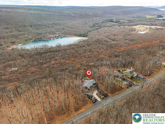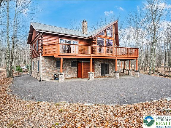 Experience exceptional resort style living in the private, amenity-rich community of Eagle Rock Resort, just 2 hours from both New York City and Philadelphia. This custom 3 bed, 3 bath log home set on nearly 1/2 acres of wooded property offers panoramic lake and mountain views and a generous mix of indoor & outdoor living in the beautiful Pocono Mountains. The main level features a vaulted open concept living room with large picture windows, hardwood floors, recessed lighting, and propane fireplace. The kitchen includes granite countertops, center island with seating for 2 and stainless steel KitchenAid appliances. The adjacent dining room is large enough to seat at least 12 guests and features a slider door to access the entire wrap-around deck, overlooking the backyard and lake. The primary suite features a walk-in closet, electric fireplace, and full bath with tile shower and granite vanity, and also offers deck access with picturesque views. The walkout lower level adds a large family room with two sliders to the patio, a 10-foot built in wet bar and 2 additional bedrooms. Eagle Rock Resort offers incredible onsite amenities include an 18-hole championship golf course, 9-hole executive course, fine & casual dining, golf shop, ski & snow sports, outdoor swimming pools, indoor aquatic center, spa & fitness center, equestrian center, activity center w/ basketball court, walking trails, 24/7 gated security & more.