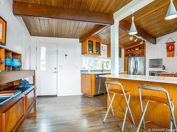 Beautifully remodeled Mid-Century Modern with large lot. Conveniently located in Ferry St Bridge area. This wonderful house has two living spaces, three bedrooms, updated kitchen and bathrooms, hardwood floors, gas fireplace. Flexible and open kitchen dining and living room. Backyard boasts manicured landscaping, large deck, fenced yard, gated RV parking and additional carport/storage shed.