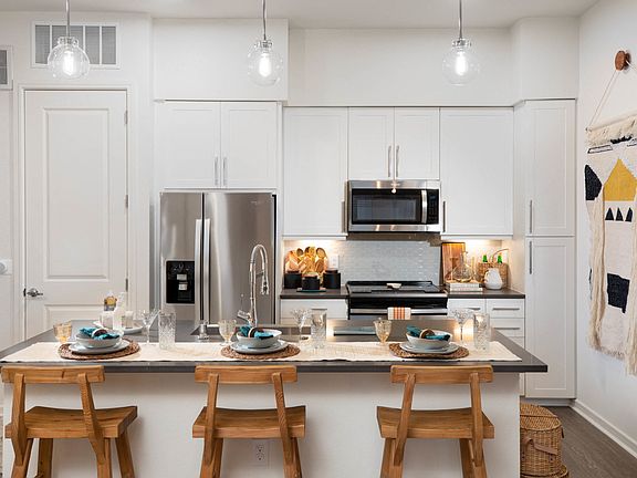 - Exterior features: Barbecue, Built-In Bookshelf, Built-In Desk with Shelving, CrossFit/Yoga Room, Electric Car Charging Stations, Entry Coat Closet, Farmhouse-Style Kitchen Sink, Game Room, Gourmet Coffee Bar, Kitchen Island, Nest Thermostats, Oversize Soaking Tubs, Package Receiving, Pet Park, Pet Spa with Grooming Stations, Private Balconies or Patios, Private yards, Quartz Countertops, Rainfall Showerheads, Resident Clubroom, TV Lounge, Two Interior Color Schemes: Gray and White, Walk-In Showers, Whirlpool Stainless Steel Appliances, Wood-Style Flooring