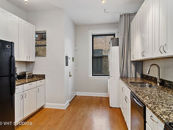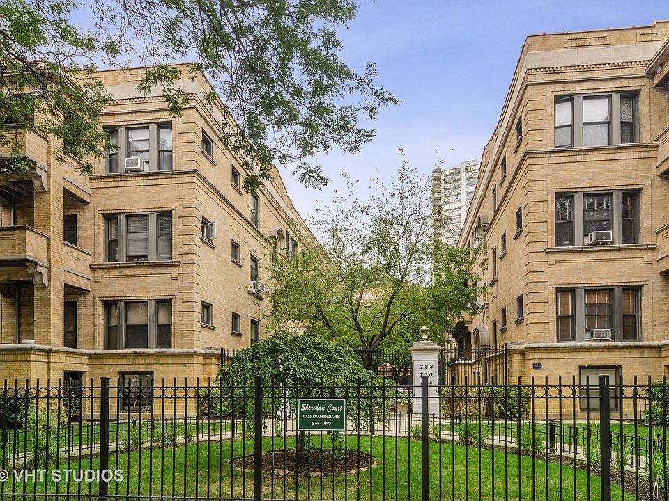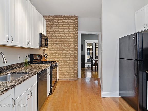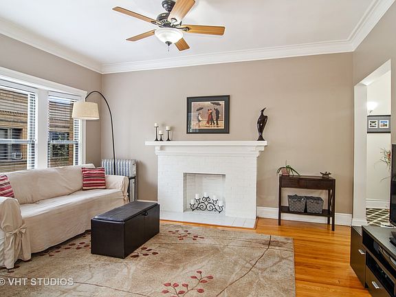 Largest floorplan in the building! This top floor, penthouse has a touch of vintage charm with today's modern amenities; a dream layout for an entertainer. Formal dining room to accommodate large gatherings, opens into an inviting living room with decorative fireplace & access to exclusive deck with tree top views, overlooking courtyard. Easy flow into a spacious galley kitchen w/abundant counter space and cabinets, featuring gas-stove, dishwasher, granite counters. Bathroom recently rehabbed with new full-sized tub/shower, new ultra-wide vanity & new contemporary polished chrome bath fixtures. Distinguished hardwood floors bolster from room-to-room. Enjoy the convenience of full sized, front loading W/D in-unit. Abundant storage closet space including a large 8x5 storage room in the lower level of the building. Nearby rental parking available for $225/month steps from the building. Easy street parking. Vibrant neighborhood walk to restaurants, grocery, shops, lakefront and Red Line.