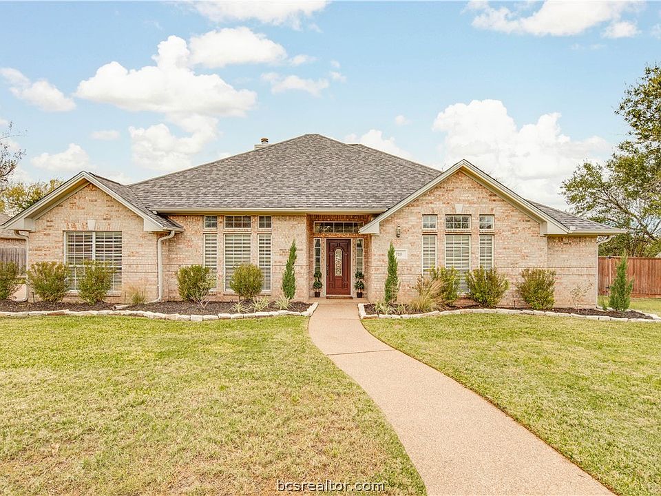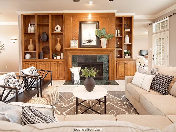 This handsome home on a quiet cul-de-sac w/ no rear neighbors offers wonderful features. Beyond the foyer a spacious living room showcases high ceilings, recessed lighting, marble tiled fireplace flanked by richly toned wood built-ins, & a wall of transomed windows w/ passage to the covered patio. Easily accessible to both living room & kitchen is the sizable formal dining room featuring warm wood flooring, wall sconces, & crown molding. Kitchens are the heart of any home, & this one is sure to please. Champagne colored cabinets contrast beautifully w/ bronze hardware & black granite countertops. Additional features include large work island w/ eating bar, built-in appliances, window seat, & built-in desk. A comfortable family room adjoins the kitchen & accesses the utility room. The private primary retreat enjoys an inviting en suite bathroom w/ dual granite vanities, whirlpool tub, separate walk-in shower, & large walk-in closet w/ built-ins and digital wall safe. All bedrooms are very spacious & feature newly installed plush carpeting, raised or cathedral ceilings, & generous walk-in closets. New HVAC w/ special filtration system installed in 2022. The oversized garage has Bluetooth garage door opener, sink and workbench; an additional electrical panel is expandable to 220 volts for generator use. Enjoy a private fully fenced backyard with scattered trees and native foliage. Motion sensor lights function dusk to dawn and draw pleasing attention to this lovely home.