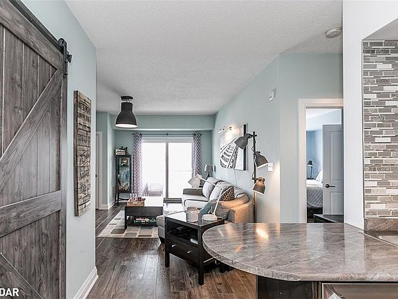 Flawless 1 Bed + Den at Yonge Station in Fantastic South East Barrie Location Just Steps from GO-Train Station & Easy Hwy400 Access. Functional Kitchen Featuring KitchenAid Stainless Steel Appliances, Breakfast Bar & Glass Tile Backsplash is Open to Bright Living Room with Patio Door Leading to Large Balcony (15' 10" x 7' 5") Perfect for BBQing. Relax in Your Comfortable Master Suite with Handy Closet Organizer or Work From Home in Your Den with Trendy Rolling Barn Door. Full Size Stackable Washer/Dryer is Conveniently Located in Spacious 5pc Bathroom with Marble Countertop. *9' Ceilings, Upgraded Lighting, High-End Appliances, Underground Parking Spot + Storage Locker, Access to Gym Included (Located in Centre of Community), Walk to Parks & Shopping/Restaurants*