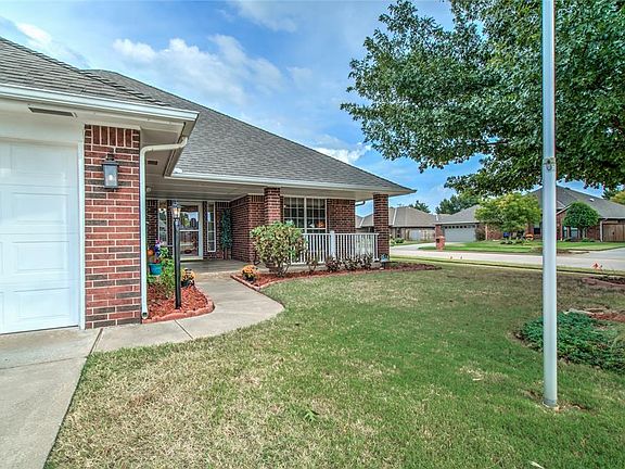 This well-cared-for, one-owner home on a corner lot in The Meadows at River Bend is ready for a new owner. Great curb appeal is enhanced by the inviting covered front porch with white railing . This is a split plan 3 bed 2 bath, or 2 bed plus study with 3 car garage. The 3rd garage bay has been used as a shop with built in work bench and sink. 10 foot ceilings in living areas, formal dining and spacious living room with gas-log fireplace. The kitchen has granite counters and updated appliances. The large primary suite has patio access and the bath has dual vanities, whirlpool tub, separate shower, and a large walk-in closet that is a safe room. The backyard offers a water feature, gazebo and storage building. See a full list of seller updates in addendums. Great location with easy access to NW 39th Expressway, Northwest Expressway and the Kilpatrick Turnpike. Schedule your showing today.