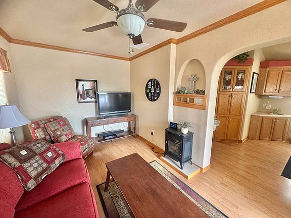Charming Park Model with Upgrades & Paid Lot Rent Through August 2026 This beautifully updated home offers 318 sq. ft. of additional space (for a total of 738 sq. ft.) and thoughtful touches throughout. Step onto the inviting ceramic tile front porch, perfect for relaxing outdoors. Inside, the living room features crown molding and an electric fireplace, adding warmth and style. The dining room is a showpiece with seven bay windows, a custom oak buffet, and an expandable table that seats eight. The well-appointed kitchen, has a reverse osmosis includes a pantry with ample shelving and a chest freezer for extra storage. The bedroom boasts bay windows and an adjustable mattress, while the versatile multi-purpose room provides a full-size washer/dryer, a mini fridge, floor-to-ceiling cabinets, and the potential for a second bedroom. Additional highlights include: 4-year-old heat pump for efficient comfort Extra insulation in floors and ceilings 4x10 storage shed. With lot rent already paid through August 2026, and that this home is completely furnished, It offers both value and peace of mind.