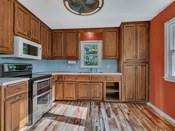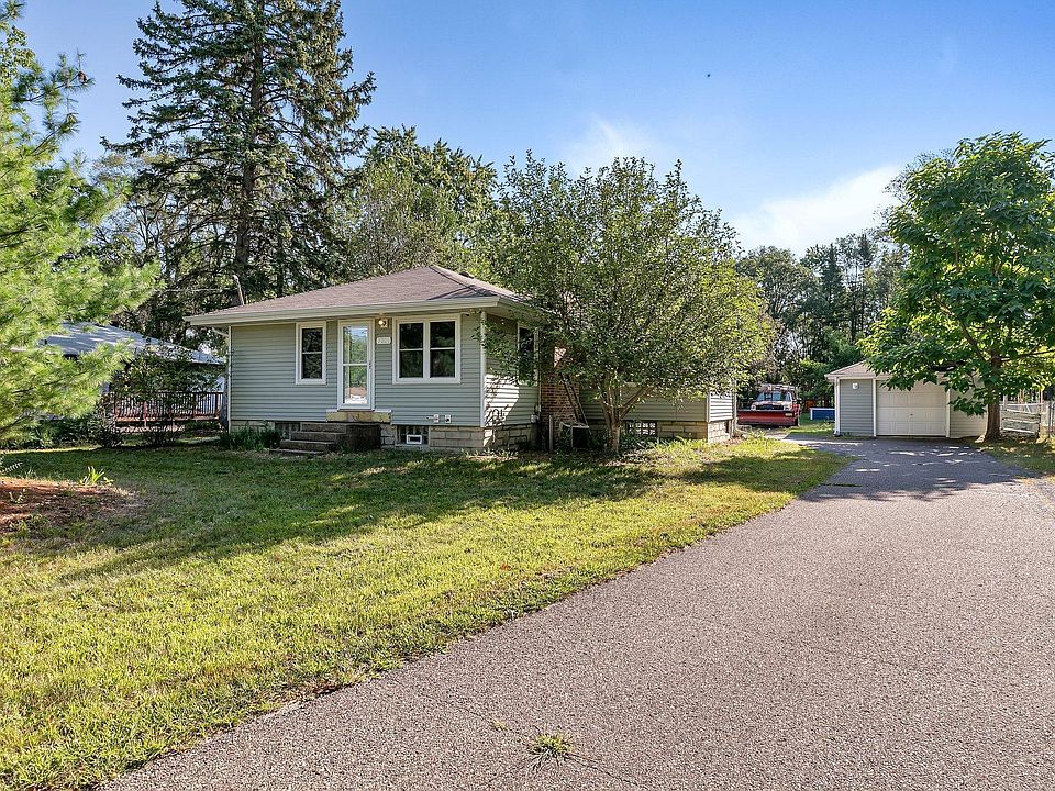 What A Great Place To Call Home! Rambler on .60 Ac City Lot! Updated kitchen offers oak cabinets, pantry, cooktop, double oven and refrigerator w/ french door and water & ice. Large living room w/new flooring and gas fireplace. 2 main floor bedrooms w/wood floors. Cove ceilings, archways, 2 metal exterior doors, high mop boards, linen closets. Main floor bathroom w/ceramic tile shower & floors and linen closet. Updates include windows, steel siding, gutters, exterior doors 2014, house roof 2009 & garage roof 2012. Lower level unfinished for an office or 3rd bedroom (needs egress window) large half bathroom and large laundry room w/washer & dryer and laundry sink. Future lower level family room. Detached garage 24x32 with storage electric and cement floors & 16x20 single car garage. Fenced in backyard offers 2 raised garden, playset, privacy and mature trees!