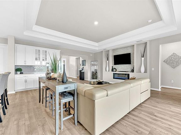 This upgraded 5-bedroom, 4.5-bathroom home offers 3,461 square feet of well-appointed living space and was built in 2023. Located in a sought-after gated community, this move-in ready home is situated on a premium homesite with no rear neighbors and tranquil views of the natural preserve. The open floor plan features a first-floor owner’s suite with tray ceiling, a spa-style walk-in shower, and an extended walk-in closet. The main living area includes luxury vinyl plank flooring, 8-foot interior doors, and elegant tray ceilings in the living room, foyer, and flex/game room. The gourmet kitchen opens to the living space and features a custom built-in wall unit with an electric fireplace, offering a stylish and cozy setting for everyday living and entertaining. Sliding glass doors lead to an extended lanai overlooking the private backyard and preserve. Additional upgrades include a wood staircase with decorative knuckle rails, custom wood blinds throughout, and a theater-style raised platform in the upstairs bonus room. The three-car garage provides ample parking and storage space, including built-in overhead storage in both garage bays. This home is located just minutes from Epperson Lagoon, Publix, shopping centers, dining options, and major commuter routes including I-75 and Highway 301. Ring video doorbell and security cameras are included. Refrigerator, washer, dryer, TV mounts, and home decor do not convey. Schedule your private showing today and experience one of Wesley Chapel’s most beautifully upgraded homes in a desirable gated community.