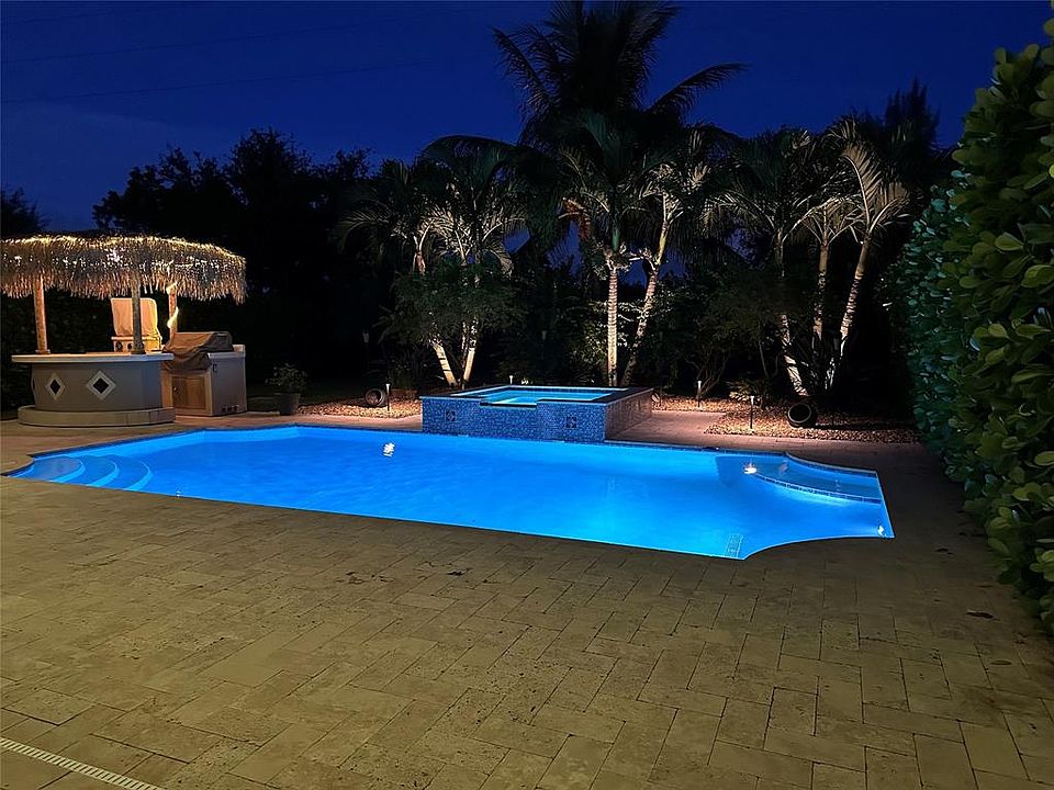 Discover this stunning 4BR/3BA one-story triple-split home built in 2016, tucked inside a cozy gated community with top-rated schools. Designed for comfort and style, it offers impact windows/doors, a spacious fenced yard, a resort-style heated pool with spa, travertine deck, covered patio, and gazebo with outdoor kitchen. WOW! Inside, enjoy a neutral, carpet-free interior with backyard views from the master suite, kitchen, and family room. The remodeled master ensuite features a hydro soaking tub, new vanities, lighting, and glass shower with rainhead. The gourmet island kitchen shines with quartzite counters, high-end cabinets, Miele induction range, & speed oven, plus new fridge and dishwasher. Added perks: epoxy garage floor and tankless water heater. A true must-see!
