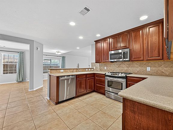 Nestled on a serene cul-de-sac, this stunning 4 bed 3 bath home boasts a two-story layout surrounded by lush trees. The open floor plan features a cozy chimney in the living room, a game room upstairs, and a spacious kitchen with ample cabinet and counter space. The primary bathroom offers a dual sink vanity, shower, and separate tub. Outside, enjoy the fully fenced backyard and front patio area. With great schools and a welcoming neighborhood, this home is a true gem not to be missed!