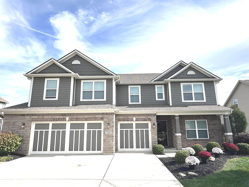 This stunning Craftsman-style two-story home is an entertainer's dream, blending timeless design with modern luxury. Wrapped in classic brick and accented with stone and upgraded cement board siding, the exterior boasts a brand-new 2025 roof and meticulous landscaping that welcomes guests in style. Inside, soaring 9' ceilings and an open-concept floor plan create a sense of spacious elegance, highlighted by a gourmet kitchen featuring a massive 101/2-foot granite island, 42" white shaker cabinets with crown molding, glass tile backsplash, stainless steel appliances, and a double oven gas range. The main level includes a versatile bedroom with walk-in closet, quality laminate flooring throughout, and a cozy gas fireplace anchoring the great room. Outdoor living is elevated with a covered paver stone patio enclosed by four retractable weather-resistant Zinga screens, dual ceiling fans, an electric heater, and a climate-controlled TV enclosure with custom cedar wall and granite-topped buffet - perfect for year-round enjoyment. The oversized three-car garage offers 22' of depth for full-sized vehicles and extra storage, while a built-in boot bench welcomes you from the entry. Upstairs, in addition to a spacious loft with vaulted ceilings, three of the four spacious bedrooms all feature walk-in closets, including a luxurious primary suite with dual walk-ins, a 72" granite double vanity, garden tub, separate shower, and private water closet. Every detail - from the professionally treated lawn to the thoughtful storage throughout - has been designed for comfort, style, and effortless entertaining both inside and out.