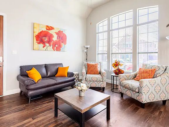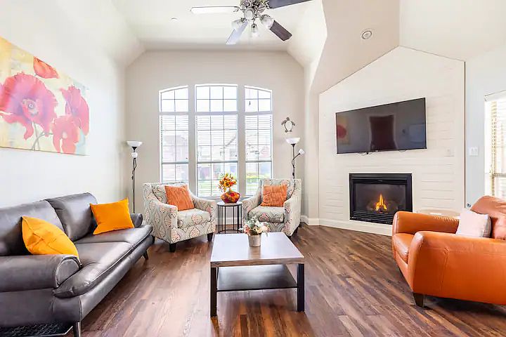 Fully furnishedOne-story four-sided brick homeCeiling fansBlackout curtainsOversized soaking tubWalk-in closetSpacious open-concept layout