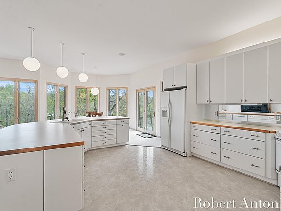 Spanning over 4,000 square feet, this elegant residence is situated at the end of a secluded driveway on a newly repaved private road. The main floor boasts an open-concept layout, including a gourmet kitchen, a spacious great room with a fireplace, and panoramic windows that highlight the tranquil, wooded landscape and riverfront. The primary suite provides a private retreat, complete with a hearth room, and a spa-like bathroom featuring dual vanities, a soaking tub, and in-suite laundry. The walkout lower level includes a full second kitchen, a recreation room with a fireplace, two additional bedrooms, and a full bathroom, ideal for guests.