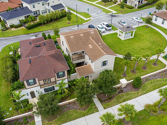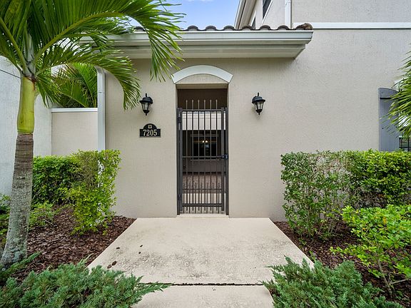 3 BR, 3 Bath, 2 garage PLUS golf cart garage (or workshop area!), oversized laundry room that includes deep under stairs storage. The espresso cabinet oversized, and sunlight-filled eat-in kitchen has stainless steel appliances, a tiled backsplash, and opens to a super-sized great room that easily showcases ALL of your formal dining and living room furniture. This 3-sided sunlight filled room attaches to French doors leading to a large courtyard with a covered patio area that has plenty of space to relax. High-end, super-modern white metal-capped pulley shades throughout. Oversized primary has a large walk-in closet, a covered balcony perfect for morning coffee (with its own nearby cabinet cubby counter for that) and of course has its own large bath ensuite w/ big circular soaker tub & granite counters. Two additional bedrooms (one with a walk-in closet) are perfect for either kids, guest or an office, with a jack & Jill bathroom connecting them, Double sinks and plenty of undercabinet storage. While highly demanded Arrivas Village is perfectly located near The Vieira shops and restaurants, just take a ride in your golfcart to get there, and easy access to I-95. This beauty will dazzle you with its rare end-unit sunlight even in the 2nd floor hallway -- that defies a high-density home community! Very pristine don't miss out!