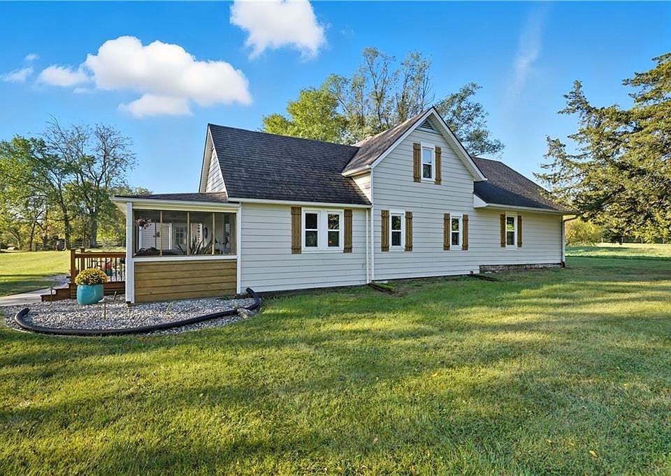 Wonderful, Updated Farmhouse, nestled on 10.8 acres, on PAVED roads! The inviting, screened porch welcomes you into this unique home with two outside entrances, gleaming wood floors and arched doorways. So many updates for you to enjoy...2017-roof, water heater, thermal windows, 2018-33' above ground pool with new liner 2025. The chef in your family will love the 2021 kitchen remodel with granite, painted cabinets and new backsplash. Complete remodel on two full baths with new tile, fixtures and marble vanities, September 2025! The laundry room, located on the main level, is so convenient. Super, cute garden cottage has so many possibilities. 30 X 40 outbuilding, with covered porch and concrete floors, was added in 2017. Huge 20' X 36' paver patio, firepit, bar and privacy fence was added in 2025 provides an amazing setting for family fun and entertaining. Many uses for the additional 14' X 24" two story barn and chicken/small animal shelter. The pond setting in the treed area is relaxing. Bonus...Paved roads to 311th St entrance/exit onto 69 hwy. Approximately 20 minutes to shops, restaurants and hospital on 159th!