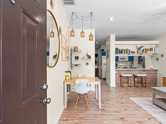 This light, bright 2 bedroom, 2 story townhouse is handy to 599 for easy commuting and has lots of upgrades! The main living space has a bank of East facing windows and a super cute pretty blue kitchen with breakfast bar. There is a full bath downstairs and good storage under the stairs with a little crawl space. Out the back kitchen door is a fenced and flagstone yard with hot tub and nice privacy. A gate leads to the two off street parking spots and a small storage shed. Upstairs are two good sized bedrooms with some nice mountain views both to Sangres and Jemez, great light, good closets and new ceiling fans. There is another full bath upstairs and the laundry is upstairs as well! With a 3-year-old roof, new stucco last year and new HVAC with AC, this townhome is all ready for its new owner!