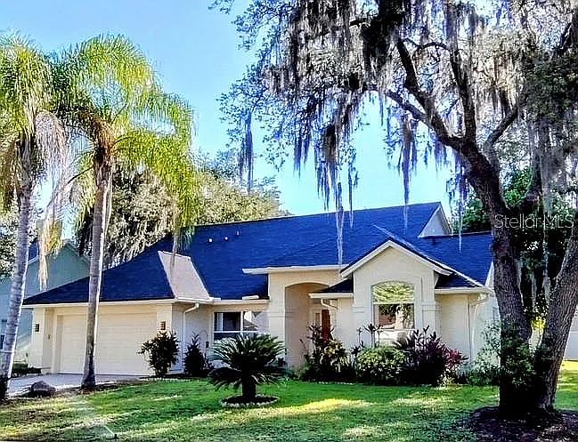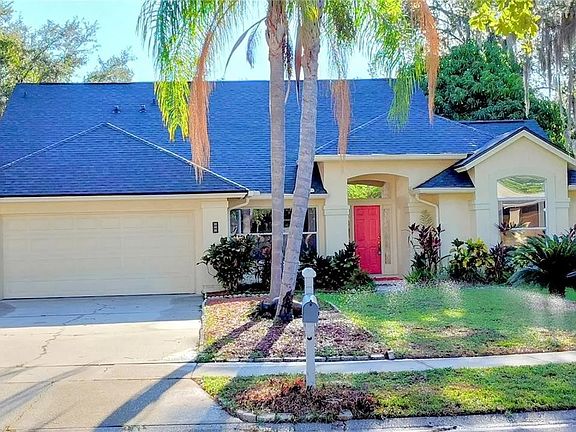Beautifully landscaped with mature tropical fruit trees, this spacious property sits on a double-sized pie-shaped lot, enclosed by fencing. The house itself boasts three bedrooms, two full baths, and a two-car garage, all on one level. With a brand new roof and bright, modern updates, soaring tall ceilings, it's situated in a charming golf course community Tampa Palms with amenities like parks, trails, pools, and tennis/pickle ball courts.