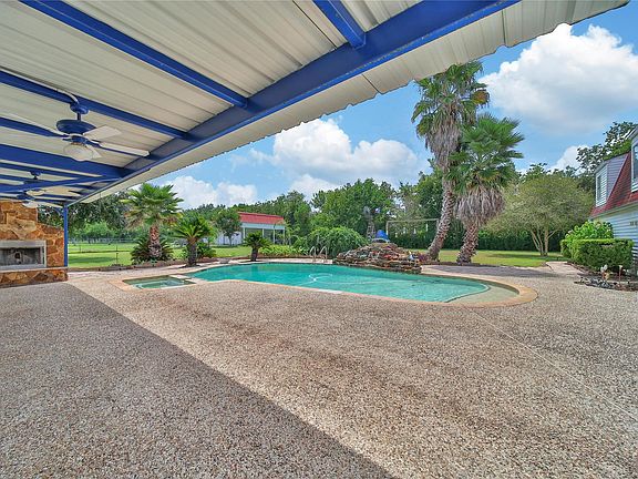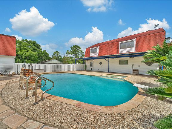 UNRESTRICTED • NO HOA • LOW TAX RATE & NEVER FLOODED!! Charming Dutch Colonial Gambrel home PLUS GARAGE APARTMENT on nearly an acre with a sparkling pool! Enjoy the enclosed front porch with a grand wood-burning fireplace. Inside features granite countertops, stainless appliances, and included refrigerator/washer/dryer. Custom built-ins, a dry bar with wine fridge, gas fireplace, and fresh paint add the perfect touch. Main home offers 4 bedrooms, 2.5 baths. Detached oversized garage includes a half bath and utility sink. The 1 bed/1 bath garage apartment with kitchenette and laundry is ideal for guests or income potential. Outside, relax on the covered patio overlooking the pool, hot tub, and outdoor fireplace. Plus a covered RV space with electric/sewage hookups and extra parking. Convenient to 288 & Beltway 8 for easy Houston access!