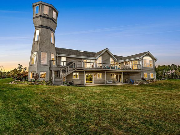 Custom craftsmanship defines this open concept, 5-bedroom modern ranch on 6.5 acres. Highlights include a lighthouse tower with spiral staircase and 360° views, vaulted ceilings, skylights, stone fireplaces, sunroom, granite kitchen, hardwood floors, and Kohler fixtures. The finished walkout lower-level features 2 patio doors, 2 large bedrooms, full bath with whirlpool tub, mini-kitchen/bar, radiant in-floor heat, and abundant storage. A 4 car insulated garage, 50-year roof, and composite deck overlooks mature trees, low-maintenance landscaping, perennial gardens and fieldstone walls to complete this high-quality, energy-efficient home. Thoughtful designs enable a fully accessible home. Impeccably cared for and move-in ready!