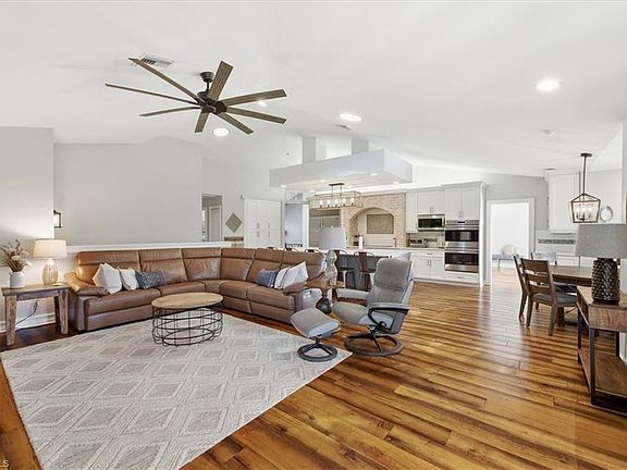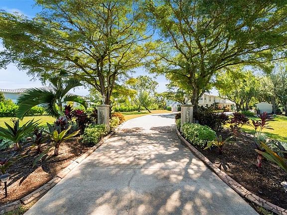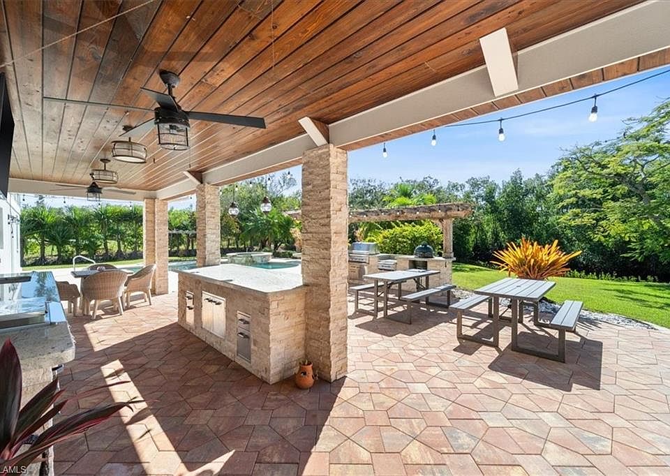 Welcome to your waterfront paradise where luxury meets convenience on over two acres of pure Florida living. This remarkable five-bedroom plus den residence offers the rare combination of direct Gulf access and sophisticated amenities that water enthusiasts dream about. The moment you arrive, the expansive concrete and paver driveway hints at the grandeur within. Step inside to discover soaring ceilings and gleaming hardwood floors throughout the upper level, creating an atmosphere of refined elegance. The gourmet kitchen stands as the heart of the home, featuring quartz countertops, shaker cabinets with crown molding, an expansive island, farmhouse sink, and premium stainless steel appliances including double ovens and wine fridge. Your aquatic adventures begin right at your doorstep with a private boat ramp and newly installed dock (Summer 2023). Within ten minutes of idling down Hendry Creek, you'll reach the main waterway leading to endless Gulf exploration. The outdoor entertainment space rivals any resort, showcasing an impressive outdoor kitchen complete with cooktop, Big Green Egg cooker, and grill alongside a private pool, spa, and fire pit. The thoughtfully designed floor plan places a recreational room, two bedrooms, bathroom, den, gym, and laundry on the ground level, while the main living area, kitchen, dining room, primary suite, and two additional bedrooms occupy the upper floor. The primary bedroom features a walk-in closet with custom shelving, while the primary bathroom boasts dual sinks, an oversized tiled walk-in shower with multiple shower heads and soaking tub. Recent major improvements include a new metal roof (August 2023), septic system (December 2024), air conditioning with new ductwork and insulation (November 2024), plus an upstairs screened porch (2024). Hendry Creek offers additional amenities including a community boat dock, Gulf access, fishing pier, and tennis court, all with remarkably low association fees. This exceptional property delivers the ultimate Florida lifestyle where every day feels like vacation.
