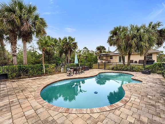 Welcome to your private sanctuary in Golden Gate Estates—a cozy, updated single-family pool home nestled on 1.14 acres of serene property. This three-bedroom, two-bathroom home plus a den offers a perfect blend of modern upgrades, spacious outdoor living, and complete privacy with no HOA, CDD, or rental restrictions. Step inside to discover tile flooring throughout, fresh paint, and vaulted ceilings, creating an inviting and open atmosphere. The updated kitchen features granite countertops, white cabinetry, a built-in wine shelf, a stylish tile backsplash, and a pantry. A window above the kitchen sink offers a lovely garden view, bringing in natural light and enhancing the bright and airy feel of the space. The primary suite is a peaceful retreat with an updated en-suite bathroom featuring a granite vanity, walk-in shower with a frameless glass enclosure, built-in bench, rain showerhead, and stone flooring. Within the en-suite bath, a walk-in closet with hardwood flooring and built-in shelving offers ample storage and organization. Two guest bedrooms share a full bath with a shower-tub combo, while a den with French doors serves as an ideal office space. A dedicated laundry area comes equipped with a washer and dryer. The outdoor living space is truly exceptional, featuring brick paver flooring and an outdoor kitchen with a bar counter, built-in BBQ, sink, mini fridge, and built-in TV, all shaded by a sun cover. The open deck provides a spacious area for relaxation, while the completely fenced-in saltwater pool area ensures ultimate privacy. Beyond the pool, a large garden area offers endless possibilities for outdoor enjoyment. This home is energy-efficient, equipped with solar panels, and boasts a whole house reverse osmosis system. Additional features include a 2018 roof, an X-flood zone location (no flood insurance required), and a smart meter with an average $22 FPL fee. Located in peaceful Golden Gate Estates, this property offers plenty of space for outdoor activities, gardening, or simply soaking up the Florida sunshine—all with the convenience of no community restrictions. Enjoy the best of secluded estate living while remaining just a short drive from Naples' top dining, shopping, and Gulf Coast beaches. Your private retreat awaits!