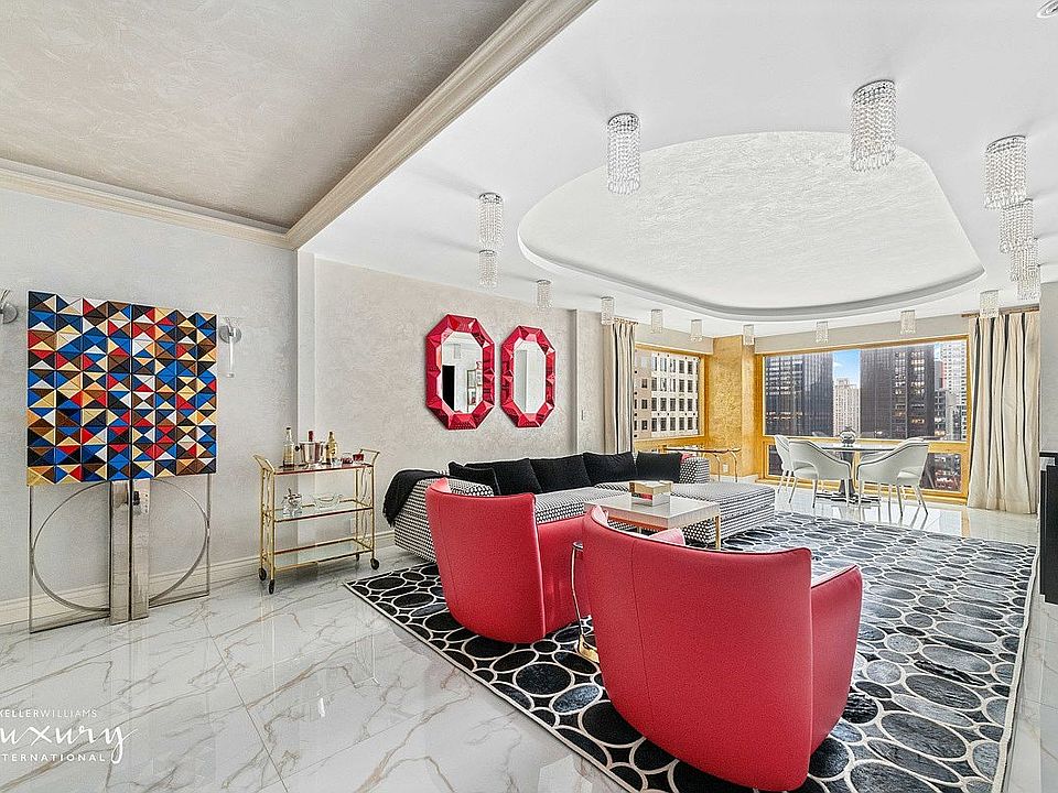 Gorgeous white marbleized porcelain floors and elegant crystal ceiling lighting run throughout the apartment’s spacious rooms creating a refined backdrop for luxurious living, beautifully enhanced with gold-leaf accent on the window mullions. The generous living room is enhanced by iconic City views, including Fifth Avenue and the top of the magnificent Aman New York, and comfortably provides room for gracious entertaining and dining.