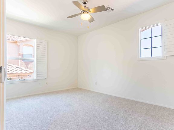 NO PETS. Application online on amaximaRealty. Stunning home conveniently located near Red Rock Casino, top dining, shopping, and highly rated schools. This well-maintained, spacious 2,314 sq ft two-story features 3 bedrooms, a loft, and 2.5 elegant baths, with all bedrooms and the loft located upstairs. The open floor plan greets you with abundant natural light, while the living/dining area flows seamlessly to the rear patio with a stylish aluminum cover. The modern kitchen features granite counters, stainless appliances, abundant cabinetry, and a spacious pantry. The master suite boasts a jetted tub, dual sinks, a walk-in shower, and a generous walk-in closet. The expansive loft is perfect for an office or playroom. Updates include two AC units installed in March 2022, stylish Sunburst shutters, granite counters in bathrooms, new sinks and faucets, brand new plush carpet, and a security system ready for activation. The backyard features enticing landscaping, ideal for relaxation or entertaining. Don't miss this great home!