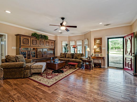 • 4,000 square feet house on 4.69 acres • Downstairs has two 10'x20’ bedrooms with bath, and a 20'x30’ master bedroom with bath • Formal living area, game room, sun porch • ¾” tongue and groove distressed oak hardwood floors throughout downstairs • For beauty and efficiency, all downstairs windows have custom, wood-framed, crank-out Anderson custom energy efficient windows • Granite wood burning fireplace • Kitchen has eight 3’x6’ Anderson windows that face backyard, barn, wooded acres • Kitchen is 23’x21’ and has a 4.5’x7’ island with hidden electric outlets on both ends, drop pendant light, hand tooled copper sink • Under-the-counter ice maker • All kitchen surfaces are granite and kitchen has top-of-the line stainless steel appliances • Mosaic artwork over sink and glass cook top • Walk-in pantry abounds with storage • 2 exits from kitchen have custom-made glazed glass doors • Upstairs has 1,100 square feet living/sleeping area that includes huge bathroom • Separate 400 sq ft “closet” that can be used as a bedroom, storage area, or master closet • Upstairs floors are pine floors. Natural light enhances the space • Entire roof is blown insulation. Incredibly efficient. Past energy bills are available. • Custom carport off game room plus 3 stall car park • Huge 30’x50’ barn with 10’x50’ upper storage area is a handyman’s or entertainer’s delight. • Entire 4.69 acres is horse fenced. Backyard proper is separately fenced. Property is wooded and beautifully landscaped.
