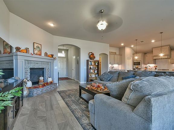 Welcome to this stunning 4-bedroom, 2-bath home featuring a bright, open-concept living, kitchen, and dining area designed for modern comfort and entertaining. The spacious kitchen boasts a gas range, coffee bar, and large island, flowing seamlessly into the dining and living areas. A cozy gas fireplace and expansive windows fill the home with warmth and natural light. The primary suite is a true retreat with a soaker tub, stand-alone shower, and walk-in closet. Three additional well-sized bedrooms and a built-in office space offer flexibility for family, guests, or working from home. Enjoy outdoor living year-round with a large covered front patio and a covered back patio, perfect for relaxing or entertaining. Stylish, spacious, and filled with natural light, this home combines comfort, functionality, and charm — ideal for today’s lifestyle. Roof was replaced in 2021 with Class IV shingles for insurance savings! Patio has a gas line for grill hook-up and the garage features an in-ground storm shelter.