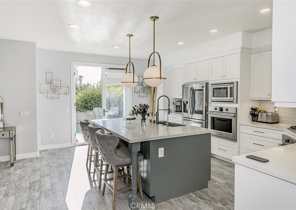 The chef's kitchen is a true centerpiece, featuring stainless steel appliances, a stylish backsplash, center island with pendant lighting, and ample cabinetry for all your storage needs. Drinking water filtration is installed for your convenience and health. Retreat to the spacious primary suite, where you'll find a second fireplace, a large walk-in closet, and a private balcony with breathtaking views of Simi Valley's rolling hills.