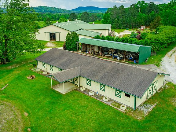 Enjoy the Equestrian Lifestyle!! This beautiful North Georgia estate is located on 15 picturesque acres with sweeping views of the mountains. The property is uniquely designed with all the amenities to accommodate the needs of discerning equestrians and their horses. It includes the main farmhouse, barndominium, two horse barns with 40+ stalls, 4 bay pole barn, indoor riding arena and a bunkhouse with four individual units. The white brick farmhouse with a full unfinished basement is situated on the knoll overlooking the pond. The main house has a large open living and dining area with rustic reclaimed hardwood floors which is separated with a see through fireplace. The kitchen has plenty of cabinetry with butcher block countertops, open shelving, stainless steel appliances and is complimented with a spacious kitchen island. Also on the main floor is the primary bedroom suite, office, guest bedroom and bath. Upstairs are two bedrooms that share a hall bath, a bonus room that leads out to a covered deck and a separate in-law suite. Enjoy the outdoors in your personal homegrown garden. The centerpiece of the estate is the sprawling barndominium complex that conveniently connects to the paddocks and riding arena. Enter the barndominium with its soaring wood walls and ceilings, spacious living and dining area that's situated to host large scale events. It comes with a full kitchen and distinctive serving area. Upstairs there are four bedrooms, two baths and an office that overlooks all horse activities. Walk through the double doors on the main floor and enter directly into the stables with 16 indoor stalls, 2 foaling stalls, wash and grooming bay, tack room, storage rooms, laundry room, his and her bathrooms with showers. Connected to the barn is a versatile 64 x 122 indoor riding arena that can be used all year round for training purposes and special equestrian events. On the backside of the arena are 13 stalls overlooking the main pasture. Altogether there are three fenced pastures for your horses. Between the farmhouse and barndominium is a separate 10 stall barn that opens up to a lighted training field. Nearby is a four bay pole barn for easy access to hay and farm equipment. Potential income producing bunkhouse with four individual efficiency suites, each with its own keyed entry. It can be used for guests who want to experience life on a working horse farm or for those traveling through with their horses and need stop over accommodations. It would make a unique place for weddings, family reunions or corporate events. This charming estate blends beauty and functionality with a multitude of living quarters and equestrian amenities located conveniently within 30 minutes of historic Chattanooga, Lookout Mountain and Chickamauga Battlefields.