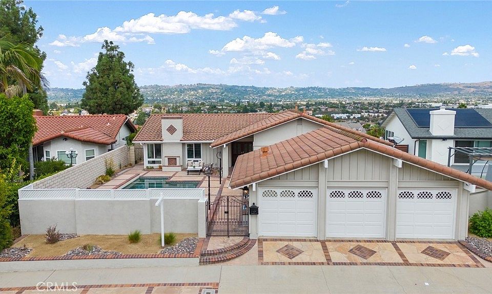 Single story mid-century modern home with fabulous VIEWS and POOL. Located on a single loaded street, this floorplan and design will not disappoint you. Splashy pool and spa are in the gated front yard and is designed as a resort style living from the grand courtyard entry all the way to the backyard. Tasteful drought tolerant plants are part of the resort themed areas from the walkways to the backyard. Grand porch double door entry into this upscale 4 bedrooms and 2 bathrooms, adds to this charming beauty. Master suite has large open closet with closet system, views and slider to backyard. 1 bedroom has 2 entrances, including a French Door entrance…great for a home office. Smooth surface lightly colored flooring throughout. Inside laundry room has private door to the exterior courtyard. Kitchen has been updated with granite counters. Kitchen opens up to family room with a breakfast bar. Family room has high beamed ceilings and picture views of the hills. Master suite, family room, kitchen and dining room have incredible views of the hills. Formal living and dining room have high beamed ceilings. Home has AC condenser, updated flooring, updated paint and updated windows. Backyard includes patio, outdoor living, and BBQ area to enjoy the La Habra views. This home is located on the border of Fullerton and close to Laguna Lake and trails.