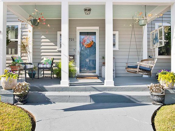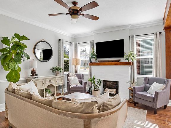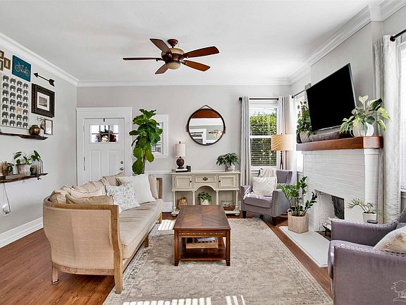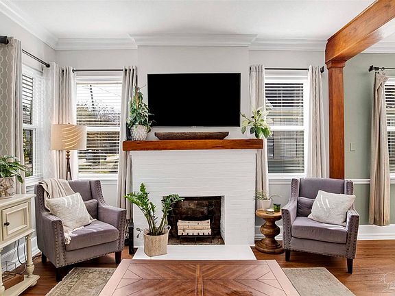 Built in 1928 and thoughtfully updated for modern living, this East Hill cottage blends historic character with contemporary comfort. From the inviting covered front porch, step into a light and bright living room showcasing luxury vinyl plank flooring, high ceilings, built-in bookcase, decorative fireplace, and substantial crown molding—classic architectural elements that define the era. The adjacent dining area offers a built-in bar with wine rack and glass-front cabinets, creating an elegant space for entertaining. The chef’s kitchen is truly exceptional, boasting charming brick flooring, granite counters, a pass-through bar to the dining area, center island, and an array of beautiful cabinetry with specialty drawers. Stainless appliances include an oversized cooktop and an oven with warming drawer. Off the kitchen, obscured-glass French doors lead to the laundry room, where the washer and dryer convey. The primary suite, located on the main level, features a spacious bedroom with two closets—one a walk-in. The primary bath offers travertine flooring, a walk-in shower, and a teak vanity topped with a vessel sink. Also on the main level is a large guest bedroom and a full bath complete with a charming claw-foot tub. Upstairs, beautifully restored original hardwood floors lead to a generous guest bedroom with its own attached half bath—ideal for visitors or a private retreat. Step outside to a privacy-fenced backyard sanctuary, where a large open patio is framed by mature bamboo that softens the landscape and creates a serene, secluded atmosphere. A workshop sits just beyond the single-car carport, along with an additional yard building for extra storage. This thoughtfully updated cottage is the perfect blend of East Hill charm and modern convenience—move-in ready and truly one of a kind.