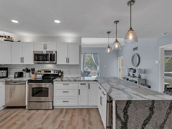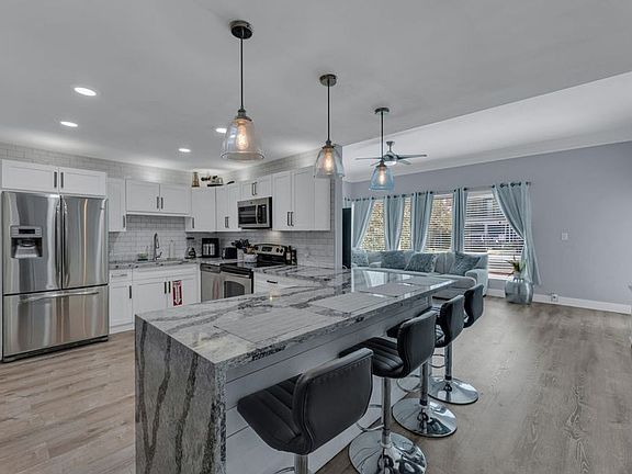 Renovated kitchenGranite countertopsLarge backyardStainless steel appliancesWhite wood cabinetsInterior laundry room