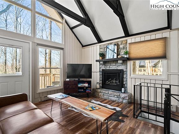 Make this Chalet your Beech Mountain home in time to escape the summer heat! Great for a weekend getaway or short-term rental property. Beech Mountain is a year-round vacation destination. EASILY ACCESSIBLE. Circular driveway is FLAT, providing easy access and ample parking for guests. Enjoy an open floor plan with vaulted ceilings and lots of natural light shining through the wall of windows in the living room. Cozy up to the stone gas log fireplace on those chilly evenings. Sleeps 8 with two bedrooms on the main level and updated full bath, bunk room on the lower level, and spacious loft bedroom with king bed and a beautifully updated ensuite bathroom. Multiple outdoor spaces to enjoy the cool mountain air. Large back deck is great for grilling. Lower concrete patio opens to usable yard space and fire pit area. Convenient location. Close to hiking trails, Buckeye Recreation Center, Buckeye Lake, and Beech Mtn Ski Resort for mountain biking and summer concerts. Sold Furnished.
