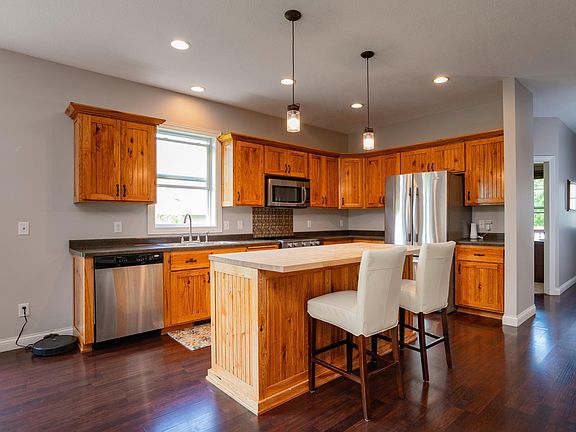 Enjoy easy one-level living with scenic countryside views just 1.5 miles from downtown Watertown! Thoughtfully designed for comfort and convenience, this home features an open main floor with hickory kitchen cabinets, stainless steel appliances, and a large center island—perfect for entertaining. Relax by the stone fireplace or take in peaceful backyard views from the sunroom. The main level offers two bedrooms, including a primary suite with a walk-in closet and updated full bath. The second main level bedroom flexes as a light-filled home office. The walkout lower level adds flexibility with a spacious family room, third bedroom, full bath, and generous storage. Outdoors, enjoy a front porch, main-level deck, and a backyard paver patio surrounded by mature landscaping and perennial gardens—beautiful views with little upkeep. The south-facing yard provides a balance of sun, shade, and privacy. NEW furnace and AC (July 2024), low-maintenance vinyl siding, and an invisible fence for furry friends add to the easy-living appeal. Friendly neighborhood with walking paths, parks, and quick access to local shops, restaurants and The Luce Line State Trail. The perfect blend of charm, nature, and convenience awaits!