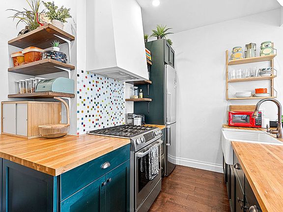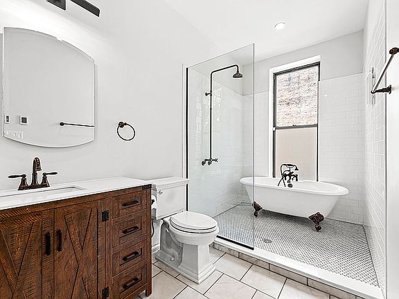 Welcome to Apartment 2 at The Barnard, an iconic boutique four-unit condo located in Historic Hamilton Heights. Lovely Unit 2 is a well laid out, 1165 sq foot, two bedroom, two bathroom floor through oasis with elegant high end-fixtures, a full laundry room with a stacked Bosch washer and dryer, central air, high ceilings, and stunning hardwood floors, and abundant storage. This northeast facing apartment boasts tons of natural light, thanks to 7ft windows on three sides. This beautiful home has an open floor plan, and the living room and kitchen are flooded with natural light from oversized windows that complement the circular living room. The meticulously renovated kitchen features butcher block countertops, stainless steel Bosch appliances, custom dark green cabinetry with a hidden dishwasher, and a farmhouse sink. The sun filled primary bedroom is home to a gorgeous en suite marble bath complete with a clawfoot tub, rain shower, and a spacious linen closet. The second bath is also beautifully renovated with intricate tile work, and the second bedroom is open and airy.