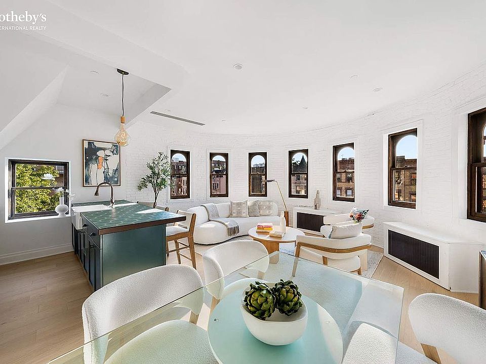 Sunlight floods the grand rotunda living room, wrapped in seven curved windows with south, east, and north exposures, and framed by exposed brick walls that whisper of the home’s storied past. Beyond, glimpses of the Midtown skyline shimmer above the neighborhood rooftops, while the open kitchen and dining area extend the space for effortless entertaining. The kitchen features Bosch appliances—including a five-burner range with a vented hood—and distinctive hexagonal tile counters that blend artistry with function.