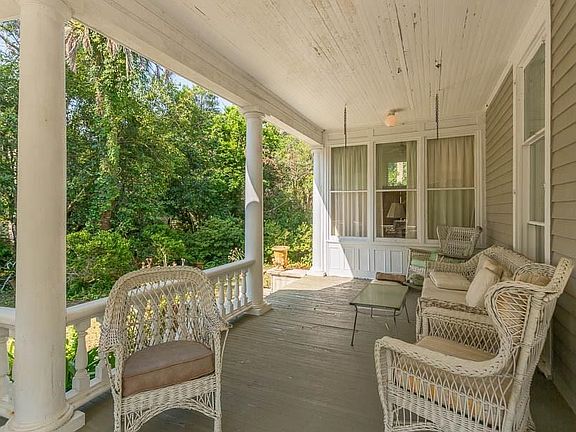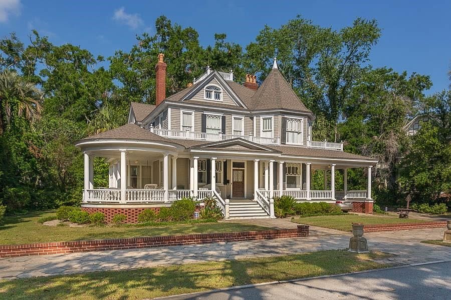 Impressive Queen Anne style home built in 1904 by the du Bignon family (former owners of Jekyll Island). Property situated on 1.5 Old Town lots. Old South front porch overlooks Union Street. Original details include leaded glass front door, heart pine flooring, wainscoting, picture railing, crown molding, 6 panel pocket doors with original brass fixtures, and 7 fireplaces. 2 stairways with original newel post/banisters. Formal dining, Formal living, Den, home office, sun room, laundry, and half bath on main level. 3 Spacious bedrooms located upstairs. Upper porch overlooks back of property. Walk up entry to a full size floored attic with architectural windows (this space could easily be finished out for additional living area). Full size basement with original wine cellar. Covered carriage parking perfect for your vehicle. Original iron carriage steps grace front lawn. Walk to the shops, restaurants, Ritz Theater, and marina of Historic Downtown Brunswick.