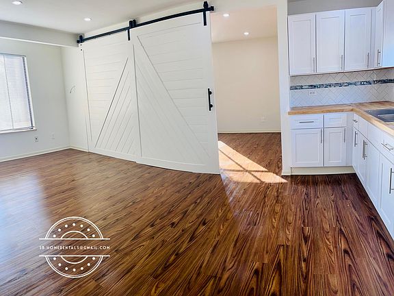 New flooringNew butcher countersNew kitchen cabinetsNew standard size fridgeBarn door sliders