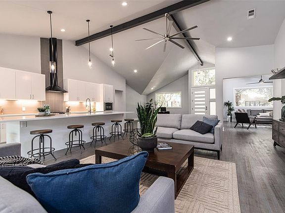 Exquisite one story home Feeding into Preston Hollow Elementary! This redesigned modern home boasts of expansive ceilings with steel I Beams, sleek walls, clean lines & stunning finish outs. Gorgeous real wood floors laid from the front directly back to the rear sliding glass doors. Kitchen has custom white cabinets, white quartz countertops, soft close drawers & a steel vent a hood. Oversized island with farm sink & built in wine fridge look out to the floor to ceiling stucco wrapped fireplace with solid steel mantle. Primary bedroom has private sliding glass doors to the back patio and a stunning bathroom featuring porcelain tile walls & glass shower. Many more upgrades were meticulously built throughout.