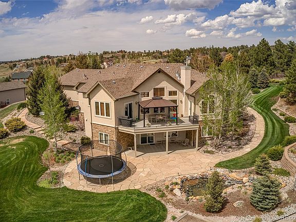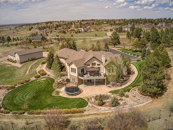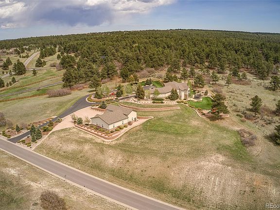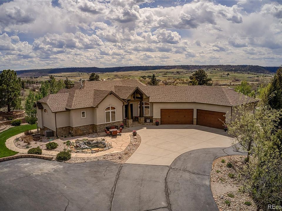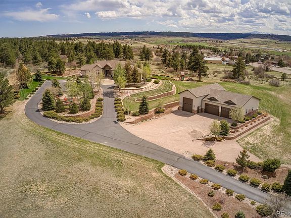 Perfectly situated atop 4.5 acres conveniently located between Castle Rock and Parker in Franktown. Step inside this beautiful ranch home and you are immediately welcomed to an open sun-drenched great room. The main floor offers a large master suite with bathroom and walk-in closet, formal dining room, oversized office with built-in's, entertainer sized kitchen with granite countertops, stainless steel appliances and breakfast nook. Walk down the curved staircase to the walk-out basement. The basement consists of 2 bedrooms sharing a Jack and Jill bath, a third bedroom suite with walk-in closet, a theater room and plenty of room for storage. Sitting on the porch, patio or walking around this beautiful property you will notice views everywhere to include Pikes Peak. If you need more room, then the attached 4 car garage then you're in luck! The fully finished outbuilding is just over 2600 SQFT, fully insulated, with water and electricity. The building will fit any sized trailer, RV or boat you can think of. This is truly a car lovers dream. Please don't miss your opportunity at this gorgeous estate.