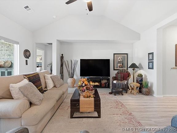 River Crest is a desirable gated community in Bixby featuring a neighborhood pool, walking trails and convenient access to shopping, dining, and recreation near 131st & Sheridan. This beautifully maintained home stands out with it's full brick and stone exterior, enhanced landscaping, and Energy Star Certification for annual energy savings. The interior offers a clean, white, and bright aesthetic with luxury vinyl flooring throughout, providing a perfect neutral palette for any style. Vaulted ceilings and large windows create an open, airy feel in the living room, which flows seamlessly into the kitchen and dining area. The kitchen includes stainless steel appliances, a stainless sink, subway tile backsplash, quartz countertops,  island and pantry door painted in a designer blue, teardrop pendant lighting, canned ceiling lights and bar seating at the island. The split floor plan features three spacious bedrooms at the front of the home and the primary bedroom, located off the living room, boasts tray ceilings, a walk-in closet and a private en suite bath with double sinks, quartz countertops, a linen/medicine pantry, a large shower with glass door & floor to ceiling tile and a private water closet. The laundry room offers upper cabinetry, a hanging bar and shelving for added functionality. Outdoor living is a delight with a covered back patio that extends into a large patio perfect for entertaining. Additional upgrades include full guttering, wooden Plantation Shutters and window shades, an alarm system, and a full privacy fence. A two-car garage completes this move-in ready home. Located within the top-rated Bixby School District, this property offers the perfect blend of comfort, efficiency, and convenience.