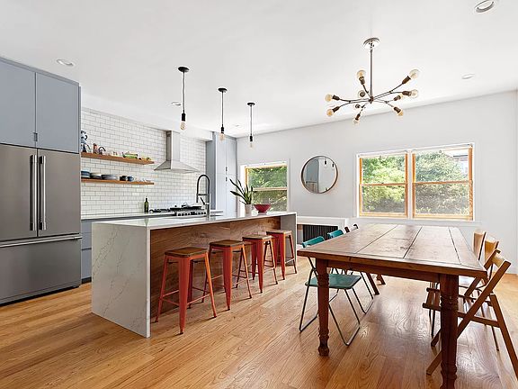 Welcome to 7212 72nd Court - a two-family brick townhouse on a lovely, tree-lined cul-de-sac in prime Bay Ridge! This home comes with parking for two cars and multiple outdoor spaces and presents a wonderful opportunity to live in your home while earning rental income. The entryway of the home opens to a staircase leading to the owner's duplex and a hallway that leads to the studio rental. The open-concept second floor is flooded with natural light and features a beautifully renovated kitchen/dining area that spans the entire width of the house. The kitchen showcases stainless steel appliances, subway tile backsplash, stone countertops, a spacious island, and recessed lighting. This space flows seamlessly into the large, sun-filled living room which is wired for surround sound and features several built-in shelves. This floor also has a set of French doors that lead to the multi-level backyard - including a balcony that's perfect for entertaining and a lower-level garden. The sunny and spacious 3rd floor of the home features 4 large bedrooms and a bathroom. The studio apartment was recently renovated and features a kitchen with stainless steel appliances, a bright spacious bathroom, and new tiled floors. Additional features include split-level AC units throughout the home, recessed lighting, hardwood floors, high ceilings, a private driveway with a garage, and abundant closet space. Conveniently located just steps away from waterfront parks and the Shore Road promenade, express bus, and commuter ferry and a short stroll from a variety of local shops, restaurants, and the R subway, this home is a special find -- call today to schedule your showing!