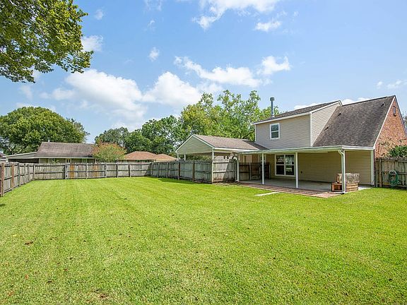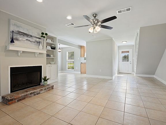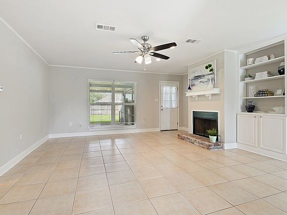 This house is adorable - a very unique floor plan - every bedroom has a large walk in closet. The family room has ceramic tile flooring, a wood burning fireplace and built in bookcase is open to the dining room. This home is on a corner lot with easy access to the large fenced in backyard. There is a very large covered patio for cookouts, etc. Updated in 2016, low flood premium.