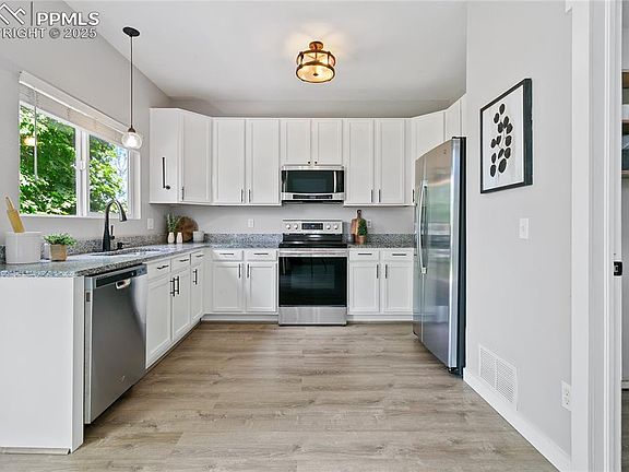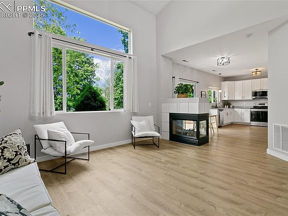 **Check out the Virtual Tour and Custom Video in the link above** This lovingly maintained 3-bedroom, 3-bathroom home is tucked into the highly desirable Range at Springs Ranch neighborhood, just minutes from schools, shopping, and Peterson SFB. With charming curb appeal, a spacious 2-car garage, and smart, stylish updates throughout, this home is a standout in today’s market. Enjoy breathtaking Pikes Peak views from two of the bedrooms and from your own front porch, a daily reminder of why Colorado is such an incredible place to call home. Step inside and be greeted by warm natural light, new low-maintenance LVP flooring, and an open-concept layout designed for comfort and connection. A two-sided gas fireplace adds ambiance to both the kitchen and great room, perfect for cozy evenings and effortless entertaining. The updated kitchen boasts granite countertops, stainless steel appliances, ample cabinetry, a large pantry, and upgraded fixtures. The eat-in dining area opens to a fully fenced backyard with space to garden, play, or simply soak up over 300 days of sunshine each year. Upstairs, unwind in the generous primary suite with a walk-in closet and fully renovated ensuite bath. Two more spacious bedrooms and a full bath complete the upper level, offering flexibility for guests, kids, or a home office. You’ll also appreciate newer mechanicals, fresh interior paint, central A/C (2020), attached garage shelving, and low-maintenance landscaping with a sprinkler system. Everything’s been done...this home is truly move-in ready. Homes in this neighborhood are moving quickly, so don’t let this one slip away! Call your agent and book your showing today, and Welcome Home!
