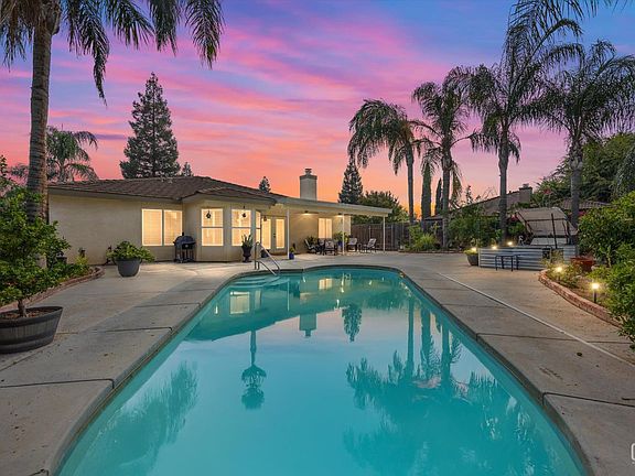 Sparkling poolCozy brick fireplaceLow-maintenance yardWood-look tile floorsSplit-wing layoutEat-in kitchen